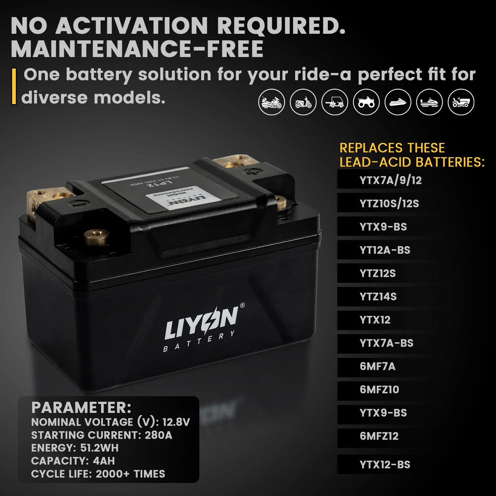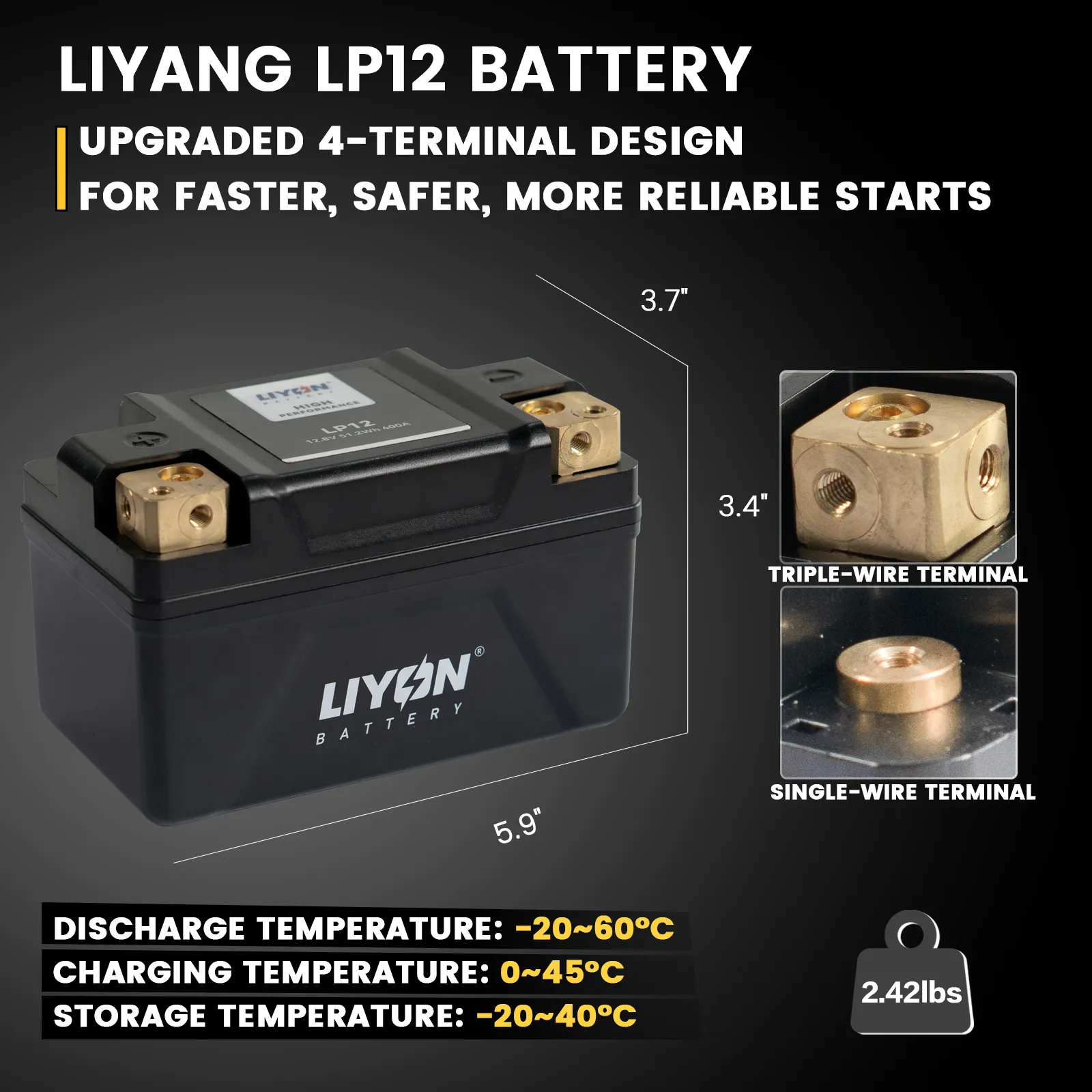 The LP12 delivers 4AH of reliable high energy density battery performance—offering more starts, deeper cycles, and up to 5× longer life than traditional lead‑acid batteries. Designed to handle demanding conditions, it’s lightweight yet powerful, providing consistent high efficiency output ride after ride.