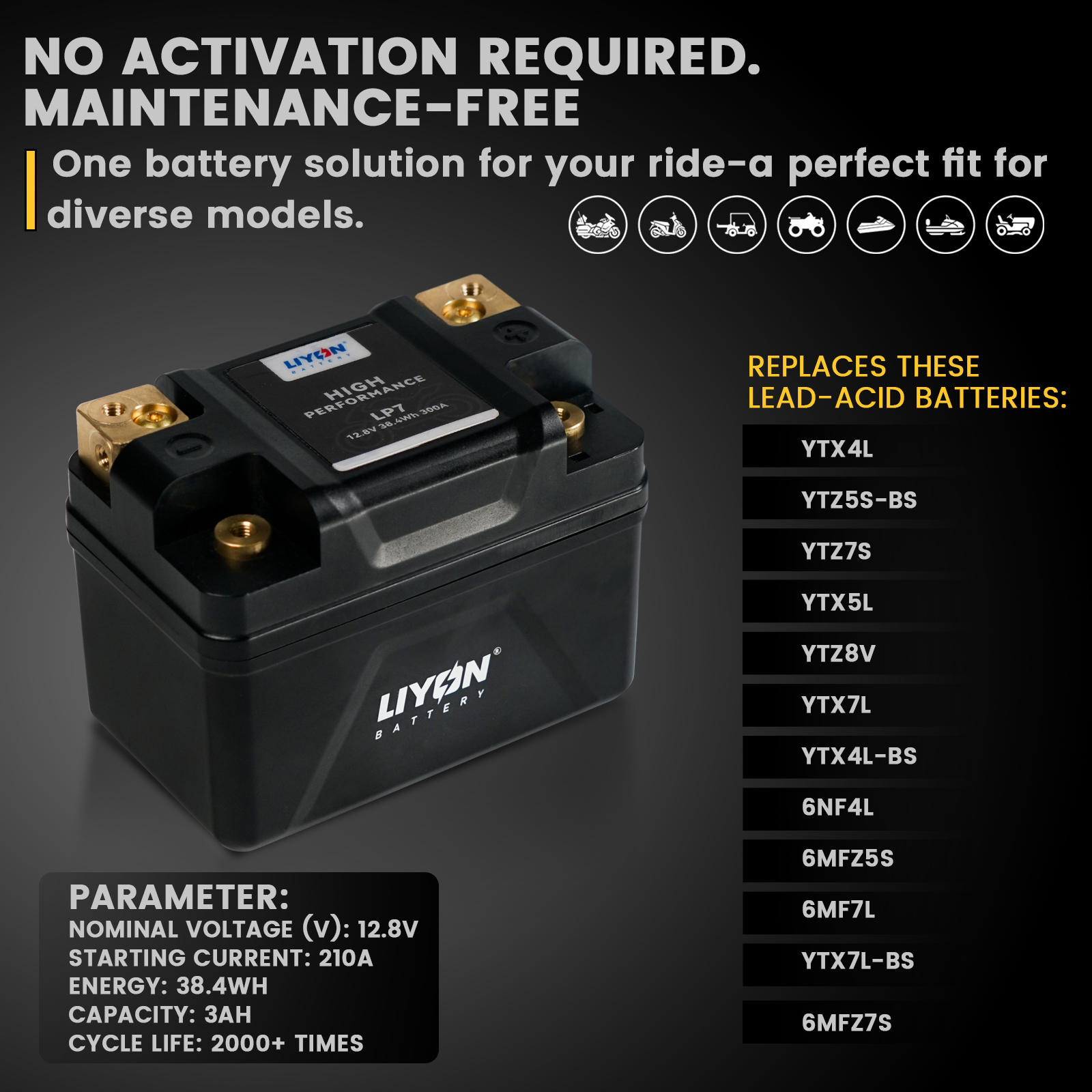 Before purchasing the LP7 12.8V motorcycles battery, measure your current battery and compare dimensions to ensure proper fit. Confirm that the positive and negative terminals match your existing setup, and check your vehicle’s Cold Cranking Amps (CCA) requirements. This model is designed for seamless installation in Husqvarna motorcycles, Alpina Snowmobiles, and other compatible powersports machines.