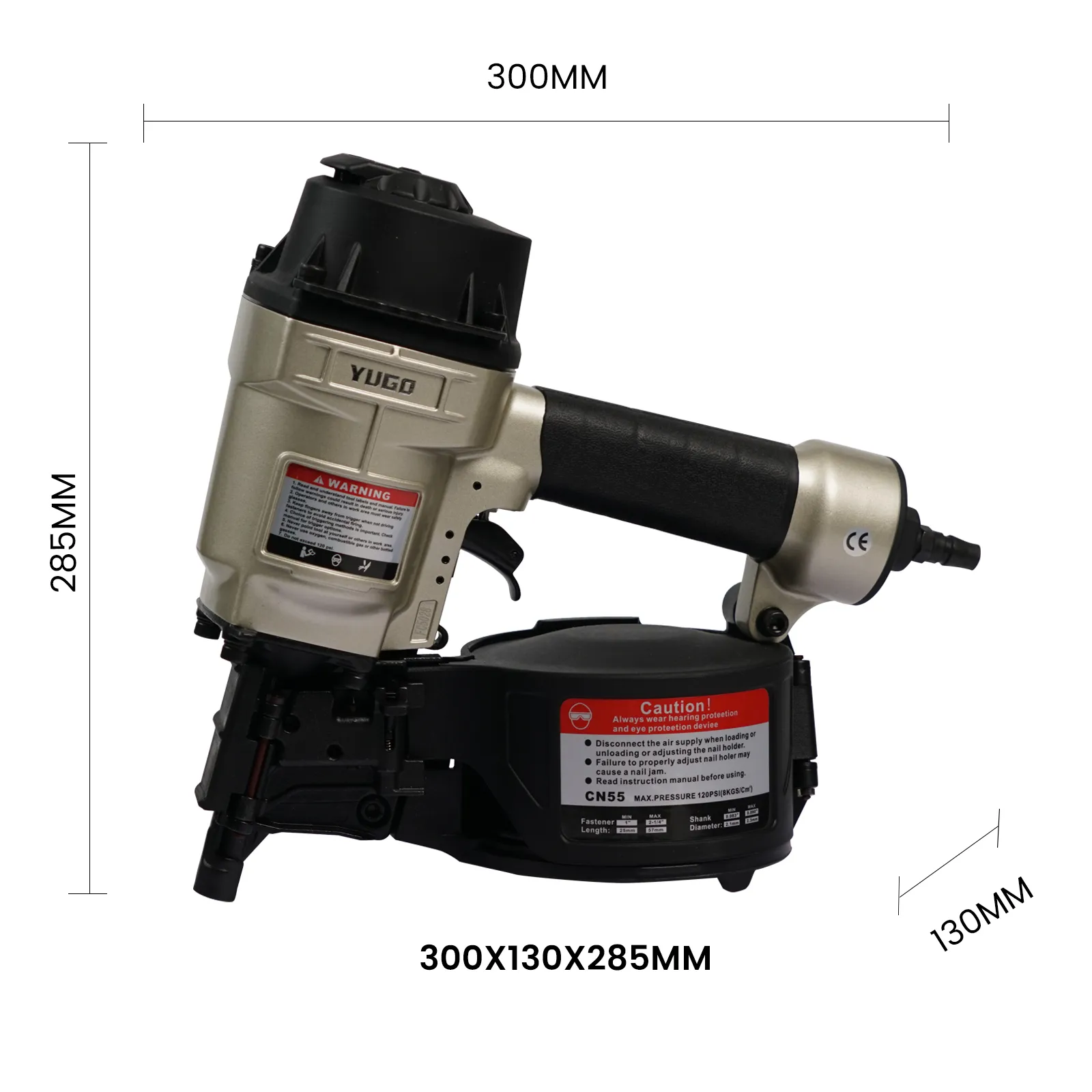 The CN55 siding nailer is a professional-grade nail gun designed for siding installation, decking, and general framing tasks. Built to deliver consistent nail power and reliable performance, it accepts nails ranging from 2.1–2.5mm in diameter with a load capacity of 250–400 nails per coil. Lightweight yet durable, this tool combines functionality and value for money, making it ideal for both contractors and serious DIYers.