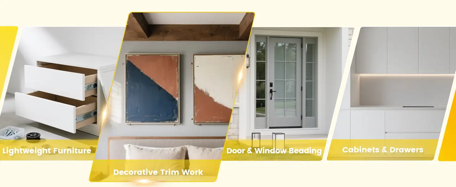 | Applications | Furniture,cabinets and drawersassembling,doors and windowsbeading,decorative trims |