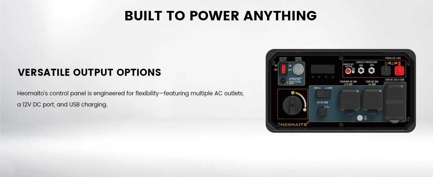 1.High Power Output – With 6100W surge and 5000W rated power, the HEOMAITO 6100W inverter generator is more than capable of running multiple high-demand devices simultaneously. Perfect for RV use, home backups, or outdoor adventures, it delivers reliable performance with the flexibility to handle anything from microwaves to air conditioners.