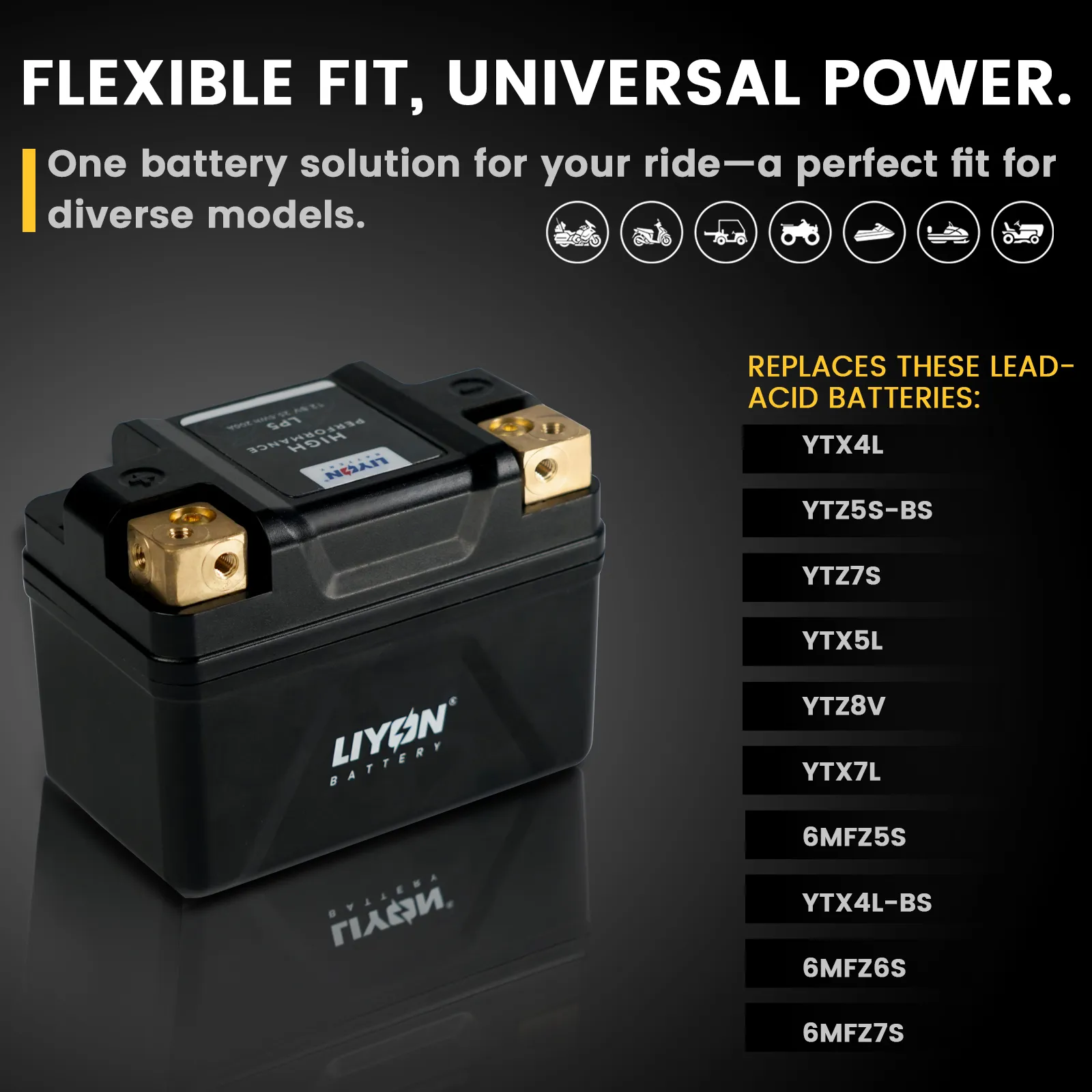 The LP5 packs rugged reliability into a 2AH lithium design—delivering long‑lasting, consistent power. With advanced cell chemistry, it offers more starts, deeper cycles, and a longer service life than standard lead‑acid batteries. Lightweight yet powerful, it keeps your ride ready in every season.