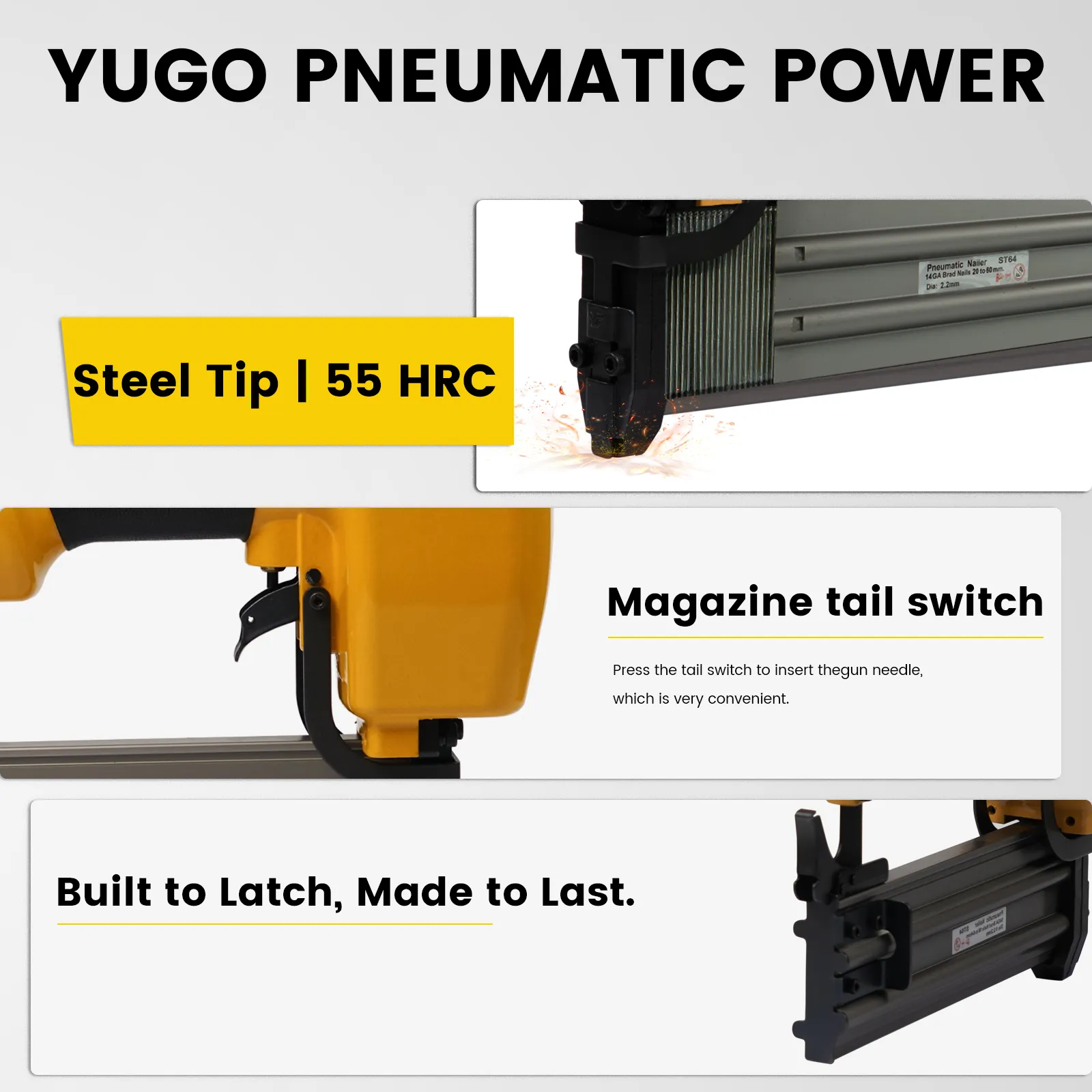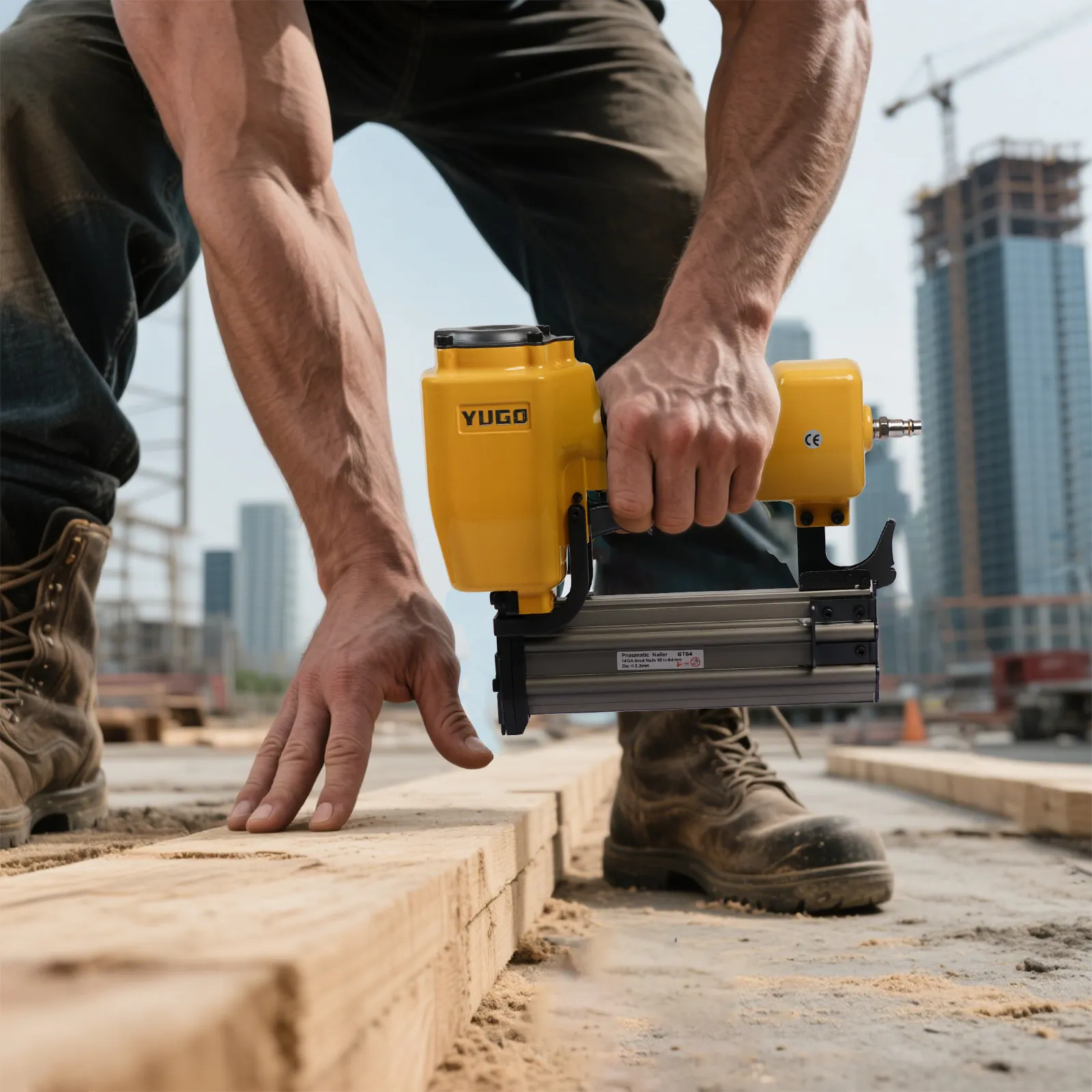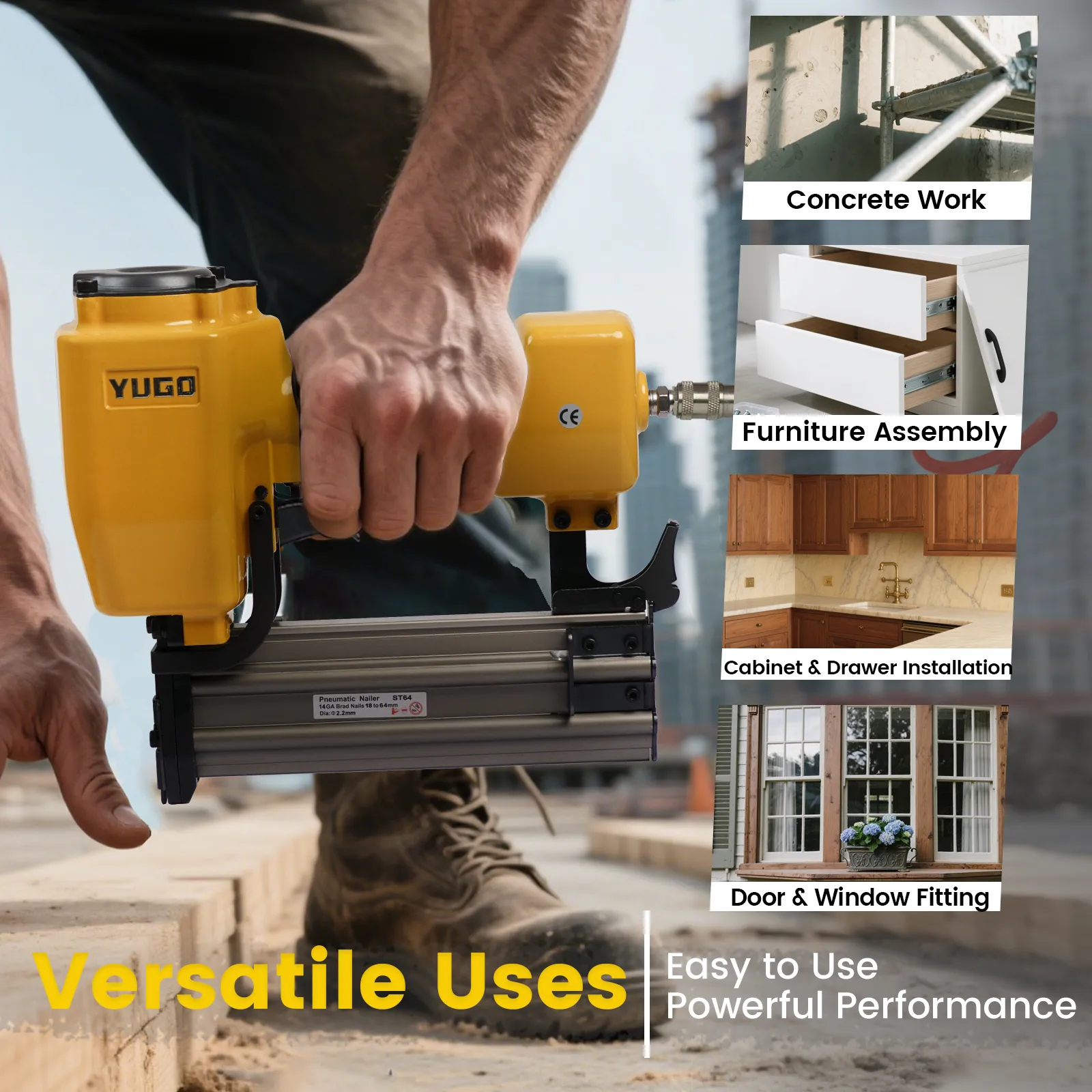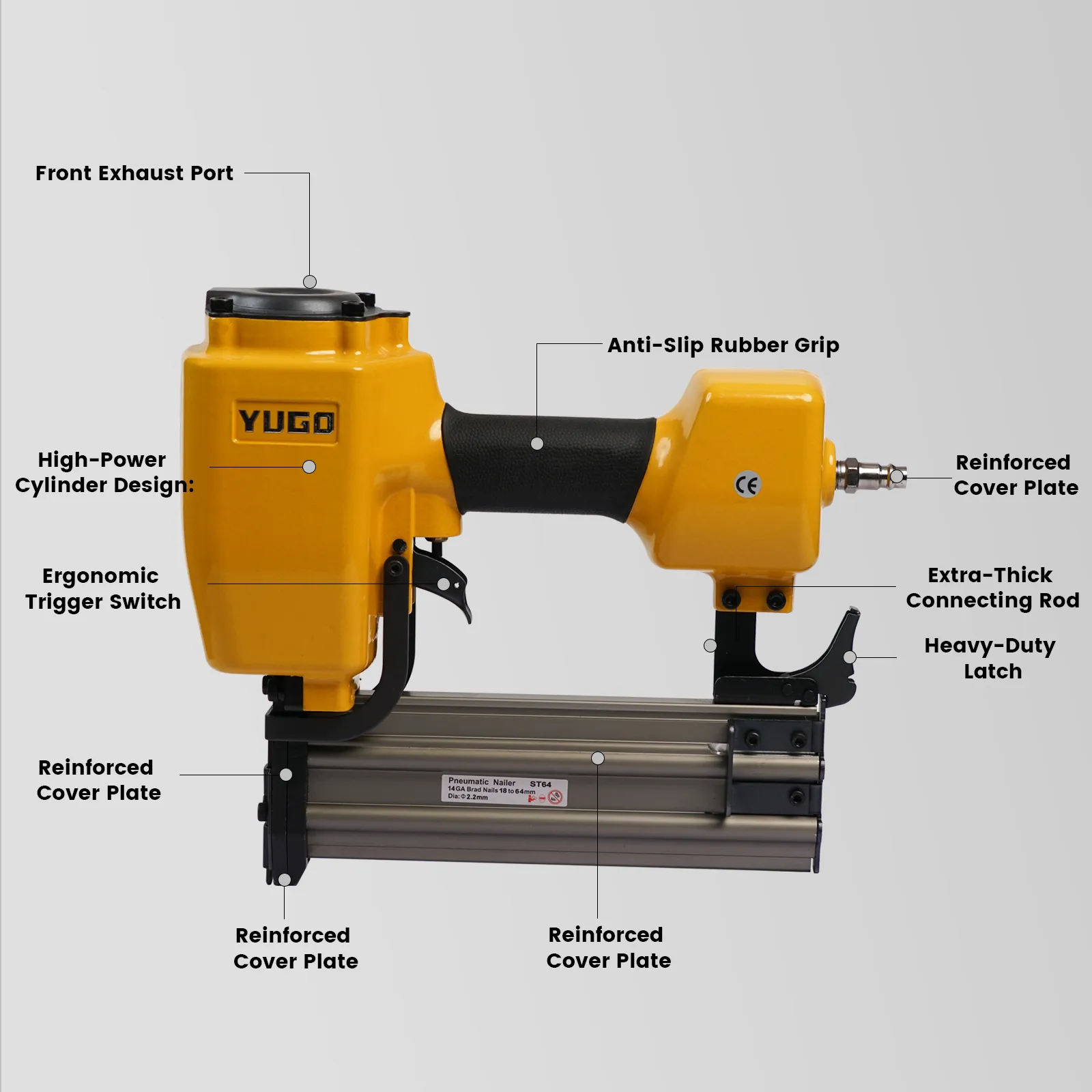 The ST64 air compressor nail gun from YUGO delivers reliable performance for both professional and DIY projects. Compatible with nails ranging from 10–64mm, this Craftsman nail gun is ideal for concrete, wood, and framing applications. Engineered for durability and precision, it ensures strong fastening while minimizing jams and misfires. Perfect for truss building, decking, furring strips, and general construction tasks.