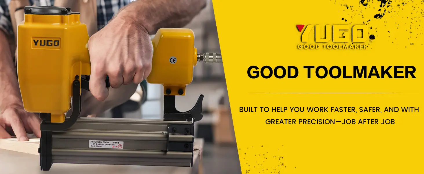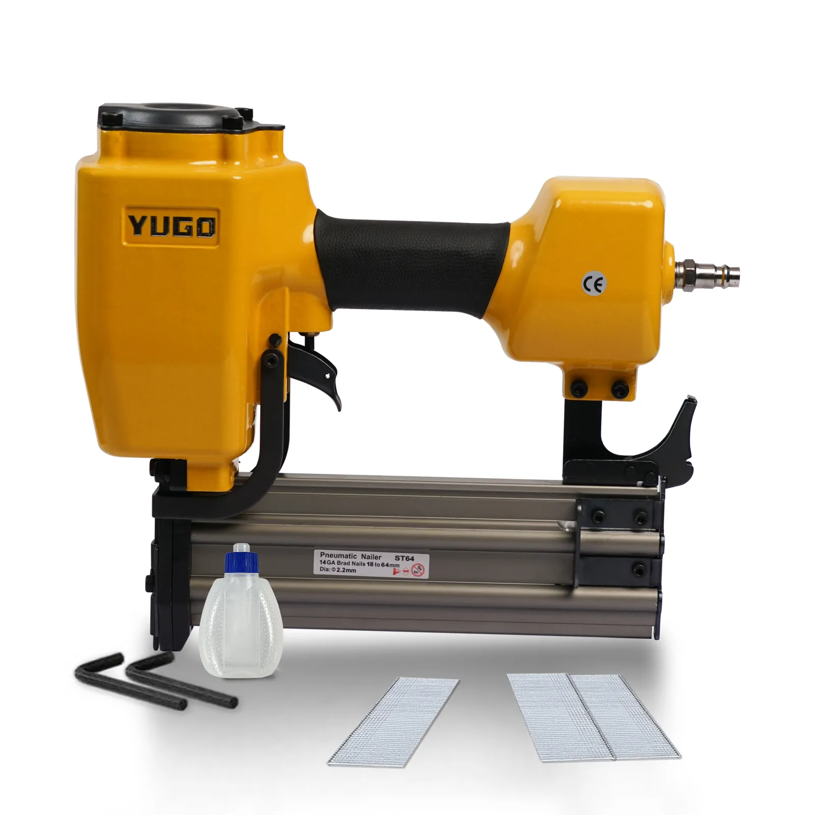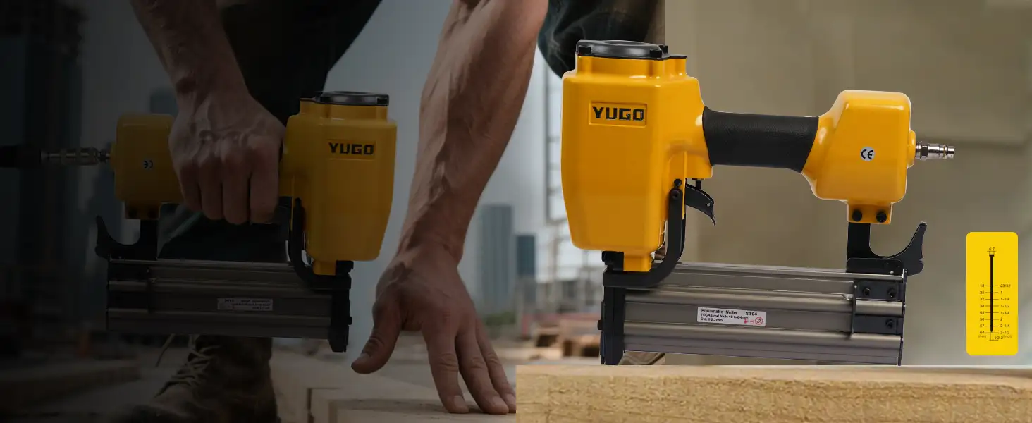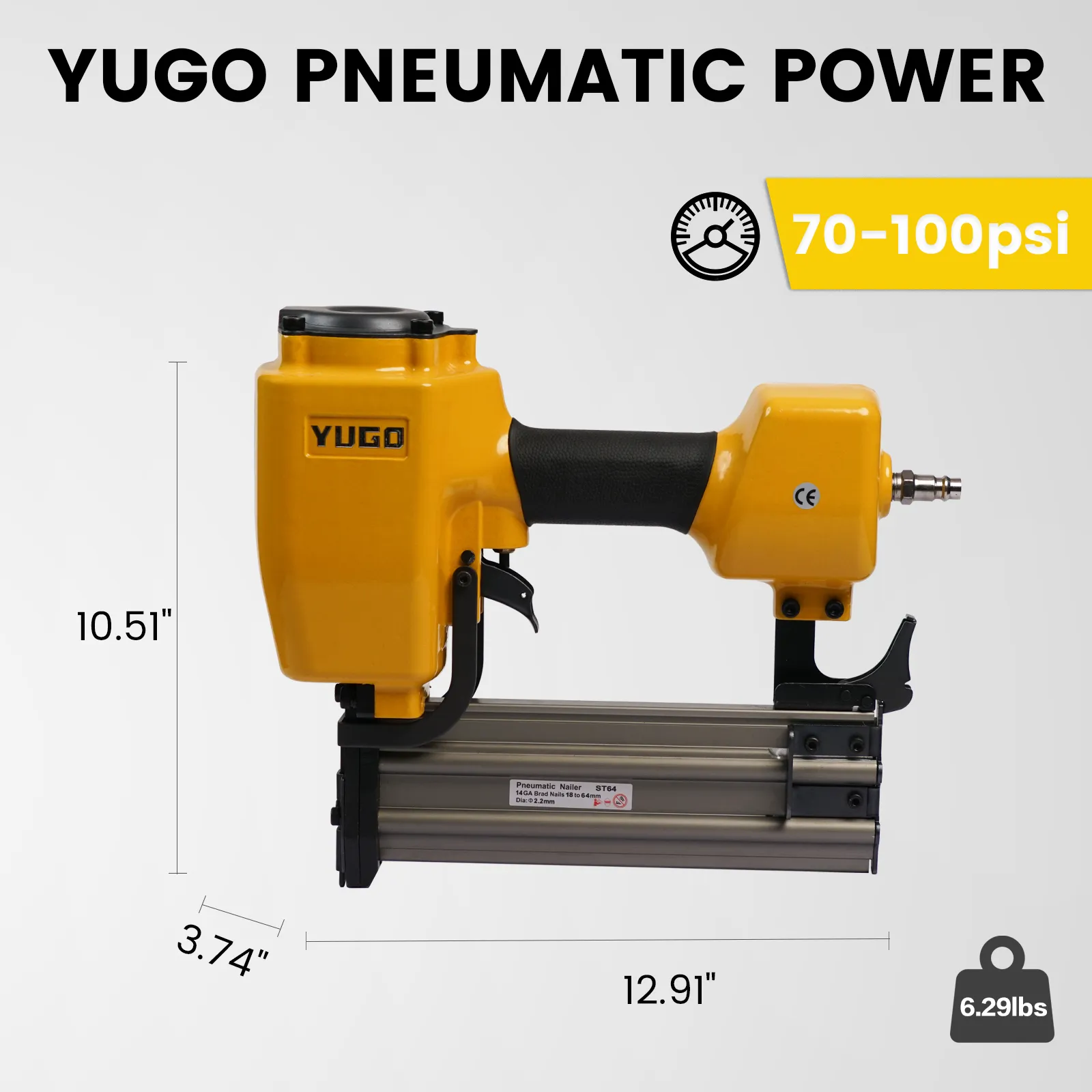 The ST64 air compressor nail gun from YUGO delivers reliable performance for both professional and DIY projects. Compatible with nails ranging from 10–64mm, this Craftsman nail gun is ideal for concrete, wood, and framing applications. Engineered for durability and precision, it ensures strong fastening while minimizing jams and misfires. Perfect for truss building, decking, furring strips, and general construction tasks.