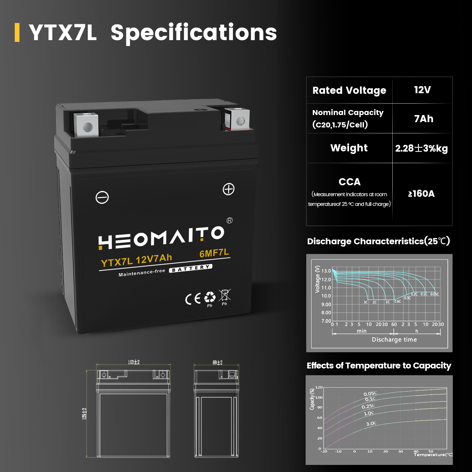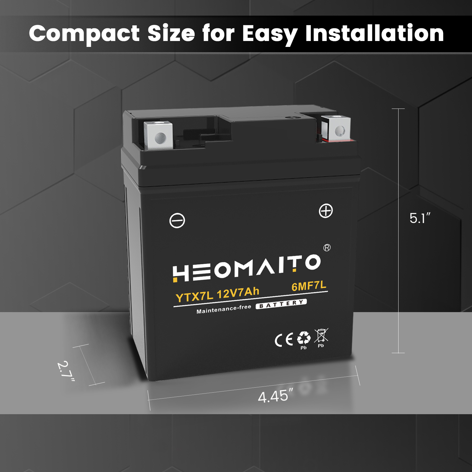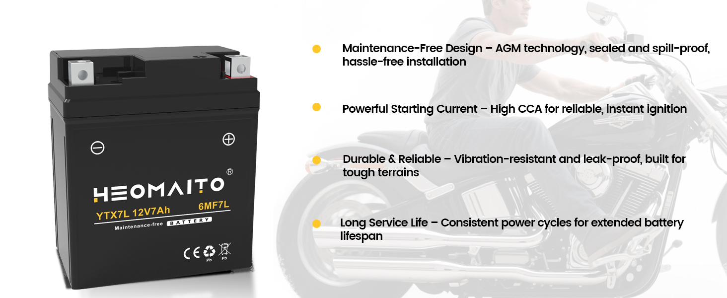 A: The HEOMAITO YTX7L-BS is a 12V 7AH sealed AGM motorcycle battery. It is a maintenance-free powersport battery designed for motorcycles, scooters, ATVs, and small vehicles. Built with AGM (Absorbent Glass Mat) technology, it offers deep cycle capability, leak-proof design, and vibration resistance, making it reliable for both daily use and seasonal storage.